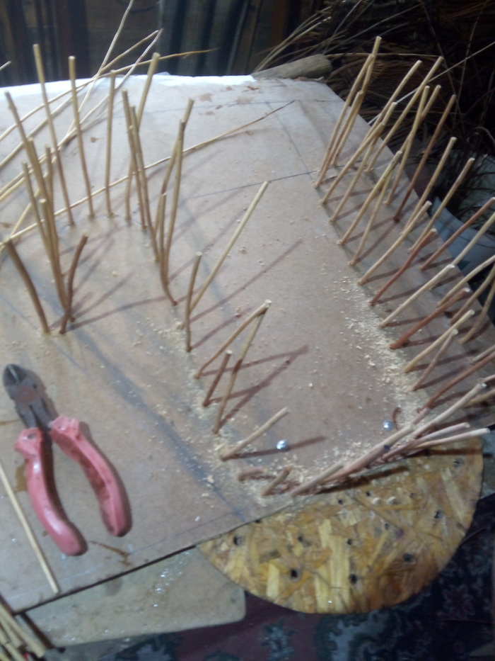 Сверлим отверстия по контуру. Растояние между отверстиями 20–25 мм.. Режу палочки длиной 120–140мм. Вставляю в наш этакий шаблон.