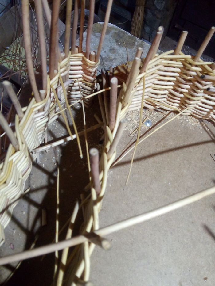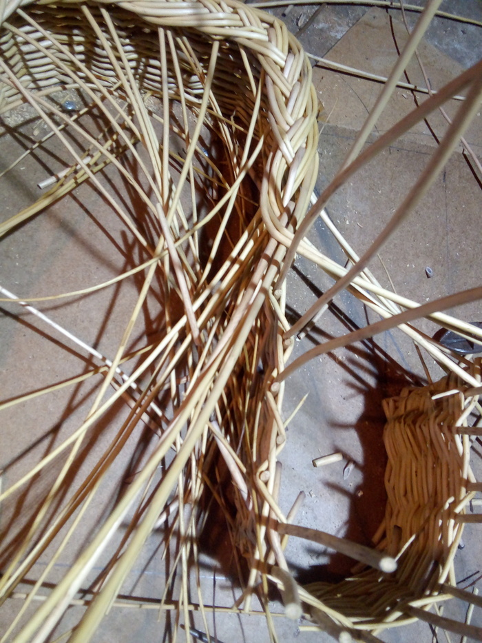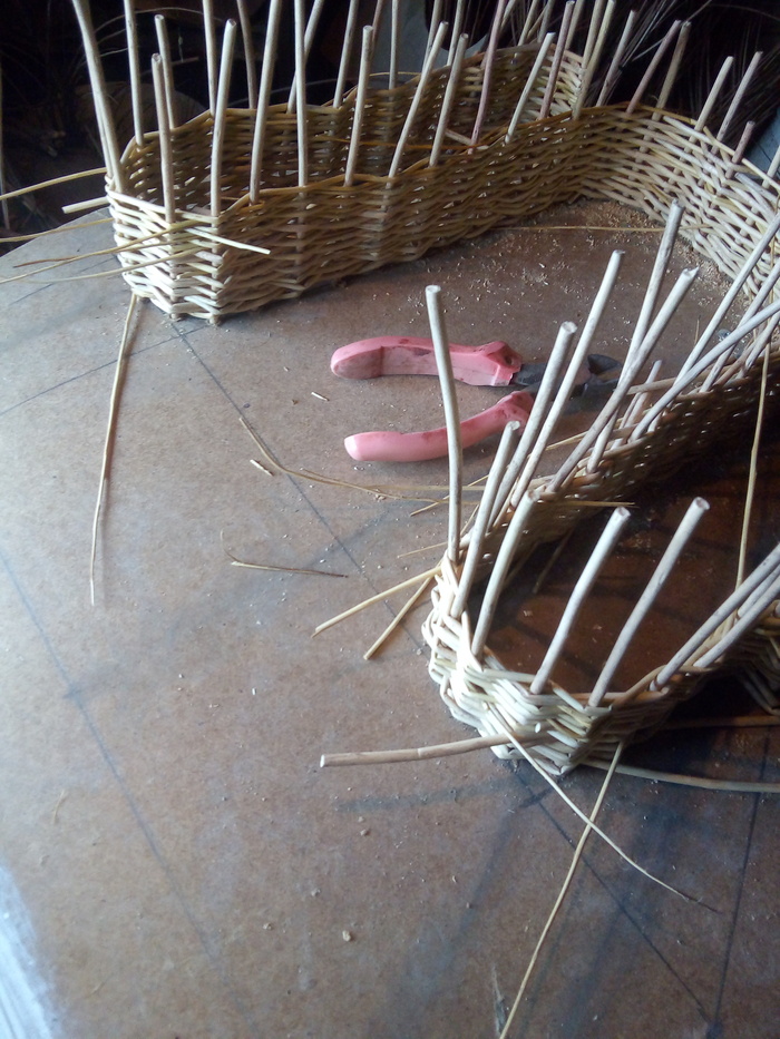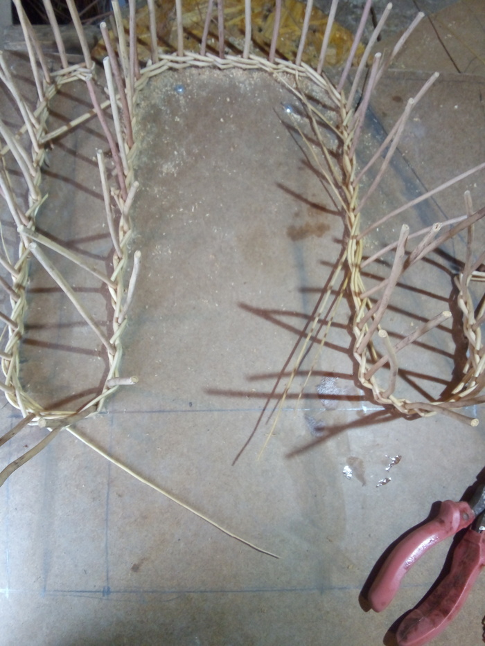 Выгоняю плетение шириной 9,5 см. Больше у меня не получится, иначе форма будет « плавать». Подрезаем стойки. Рядом подставляю стойки, как можно глубже, помогаем шилом.