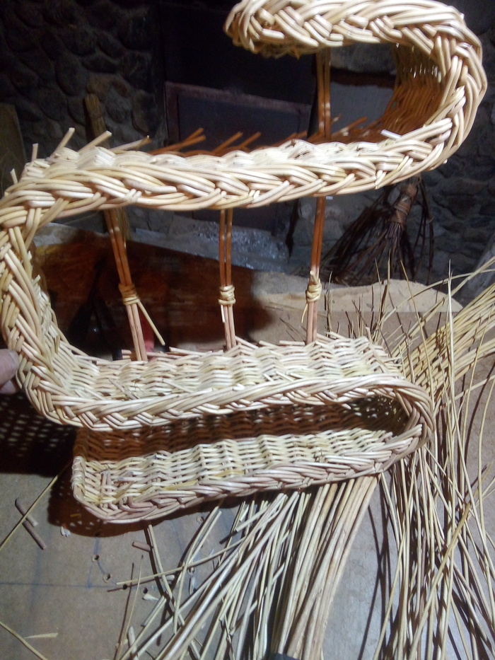 Стараемся «держать» стойеи–формк.»Плетём простым плетением один, через один. Из « шаблона » не выгимаем, форма очень слабая. Далее закрепить верёвочкой в два прута.
