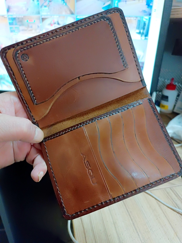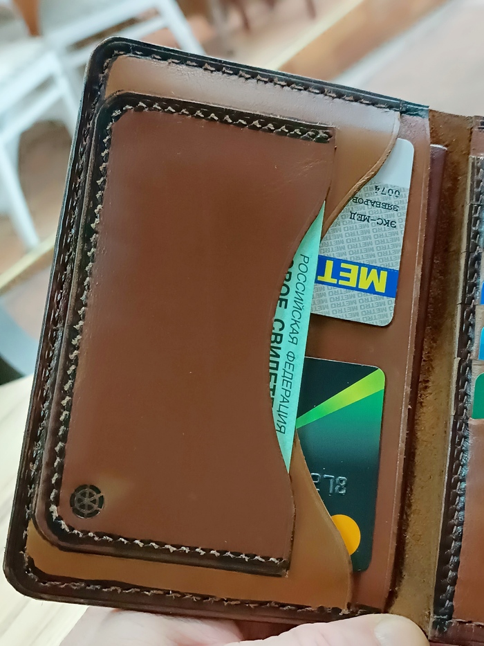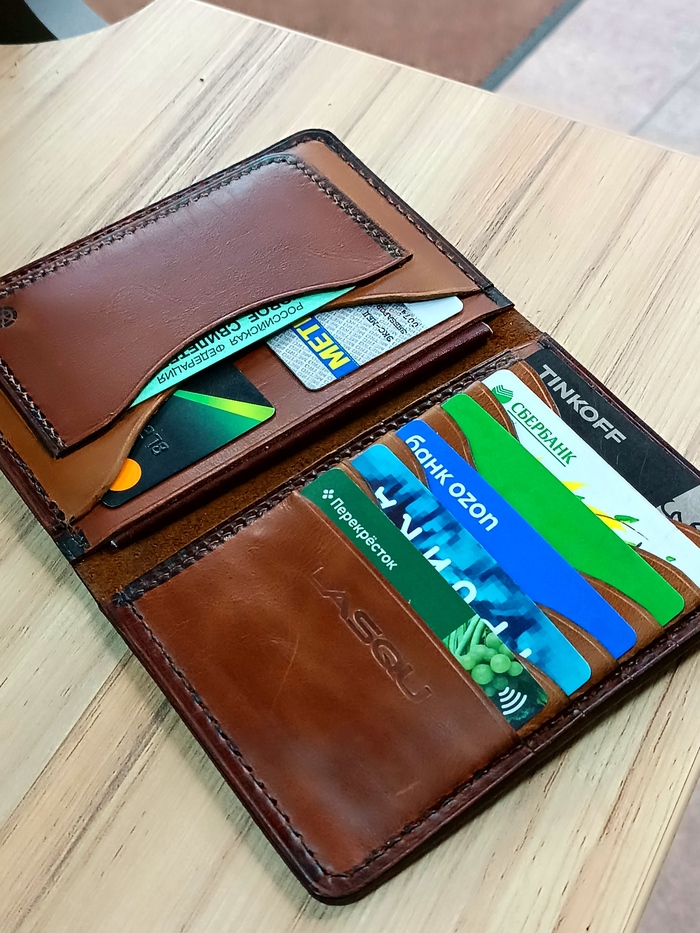 Нашел обрезки кожи от сумок, и сделал такое портмоне.