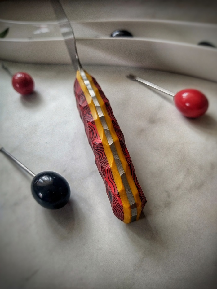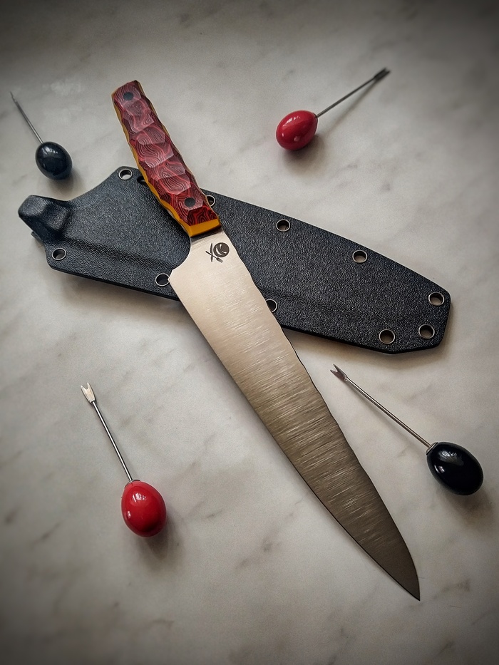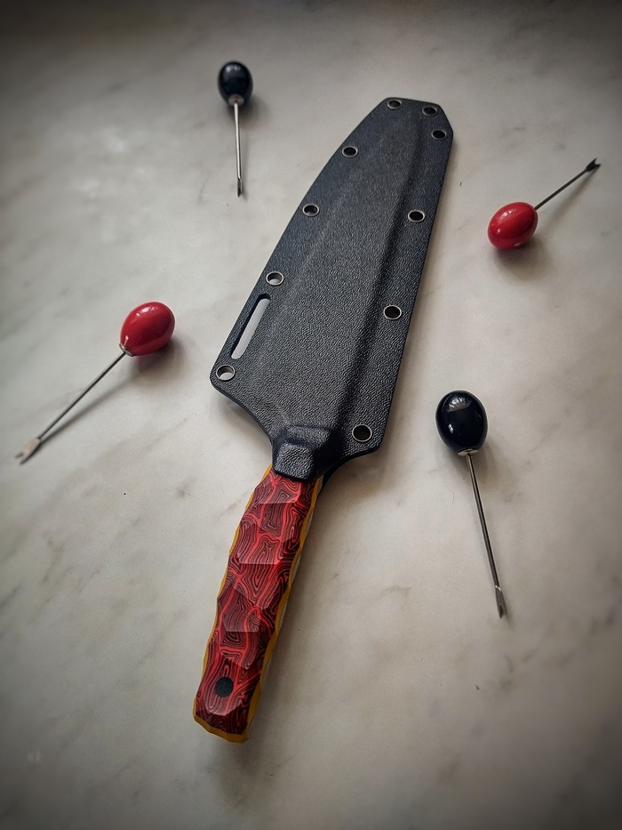 Приветы. Сегодня покажу не совсем обычный вариант кухонника, отличие от стандартных ножей такого рода- это ножны. Здесь они не кожаные, а формованные из АБС пластика. В остальном нож как нож))) клин 195х40х3мм, сталь COR-X, рукоять G10.