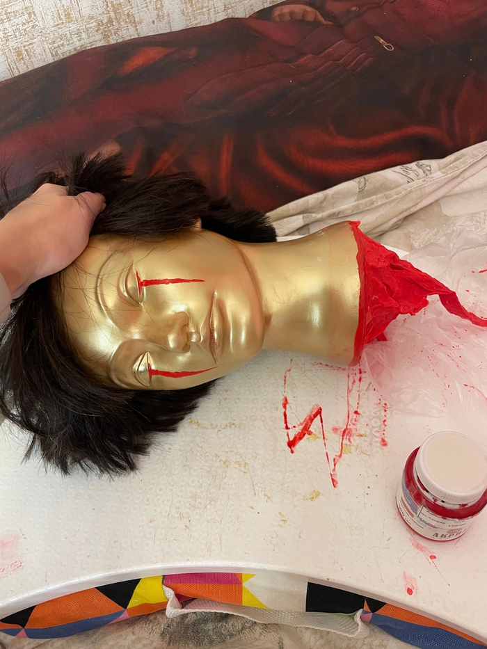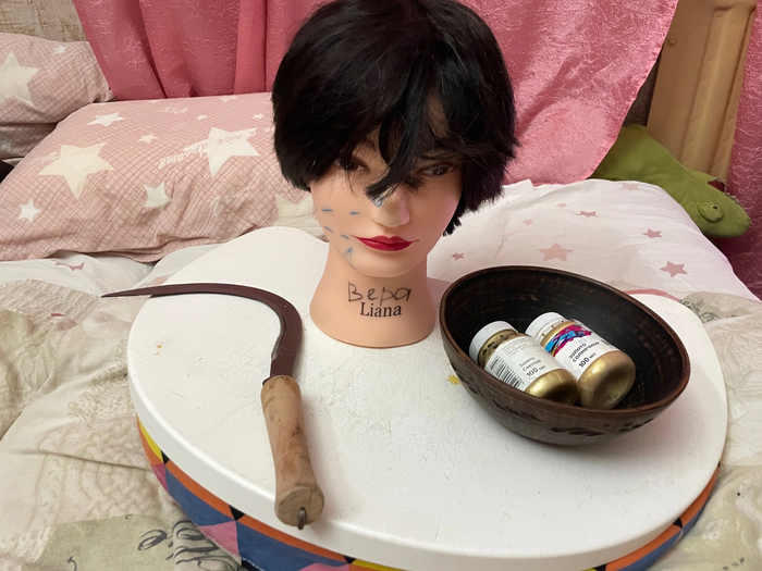 Для конкурса понадобился реквизит: серп, голова манекена и симпатичная этно тарелка. Голова у меня была, оставалось все это покрасить.