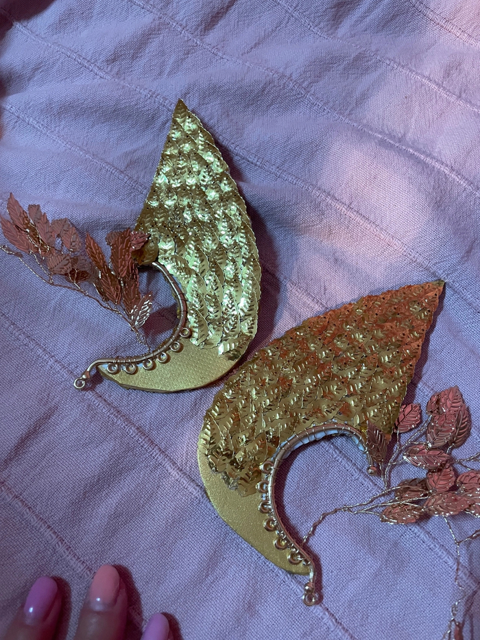 Среди фурнитуры была основа для каффов, я пришила к ней еву проволокой, покрасила в золотой и решила обклеить это все пайетками в виде листиков, а сверху нагромоздить еще более обьемную фурнитуру из листиков. Тяжело описать что я делала, попробую показать: