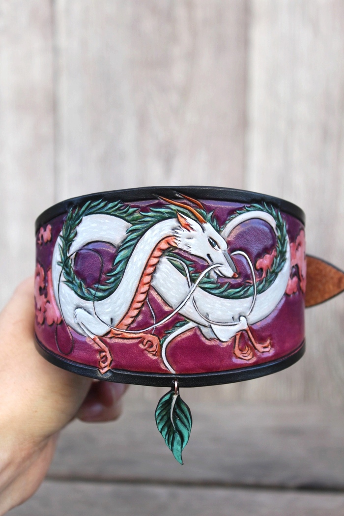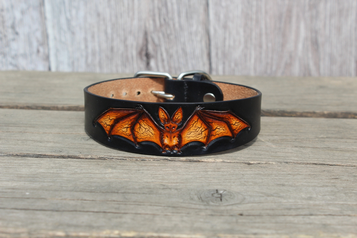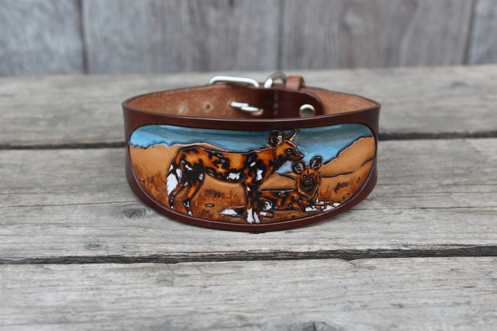 Ошейники изготовлены из натуральной кожи растительного дубления, рисунок выполнен в технике карвинг. Окрашено проникающими красками для кожи.