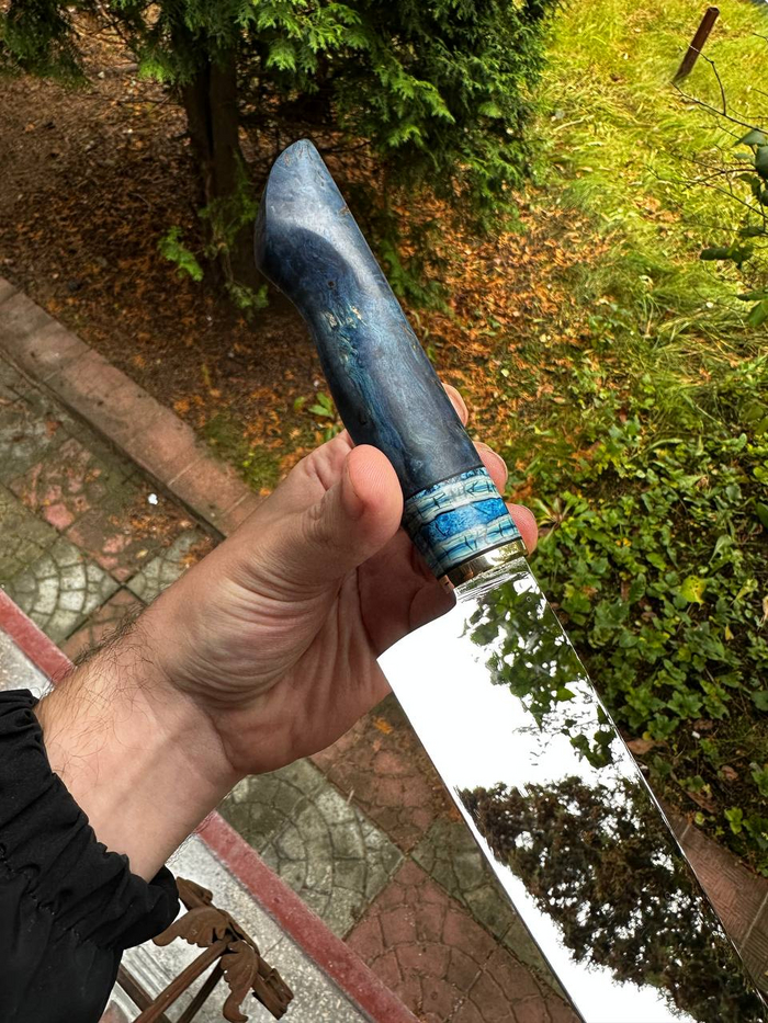 Сталь - Elmax, 61HRC. Рукоять - стабилизированная карельская береза, стабилизированный зуб.