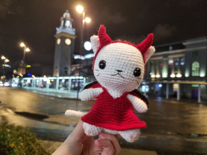 Кошечка вышла чуть большей по размеру, чем магический котик, потому что в этот раз я использовала другую пряжу и, буду честна, мне не очень понравилось, как она повела себя в этой игрушке, как мы с Tori заметили, «Семеновская «Суфле», особенно белая, ложится как-то "дыряво".