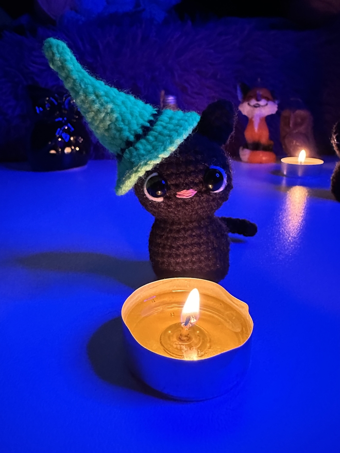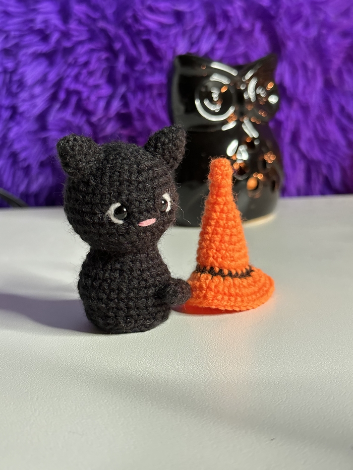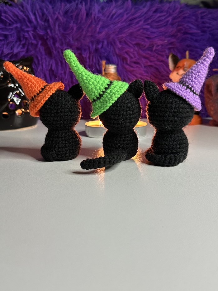 Искала, что бы связать к Хэллоуину и наткнулась на схему этого котика. Получился такой чертёнок)))
