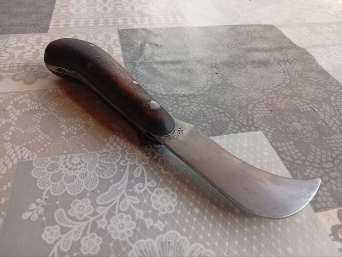 После смерти дедушки разбирал ящики, в которых конечно же сохранилась куча полезного, в том числе инструментов. Среди них внимание привлек садовый нож. Неуникальный, таких полно на авито и блошиных рынках, ценности в нем, кроме памяти для меня - никакой. Помню, как он использовал его на даче, когда я был ещё маленьким. Поэтому я решил довести нож до состояния, чтобы его было приятно брать в руки. Пациент попал ко мне в таком виде.