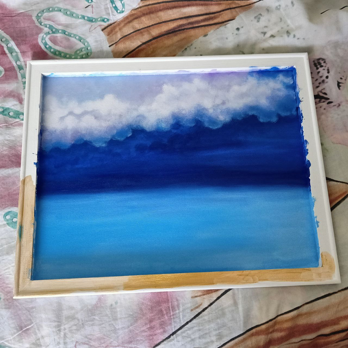 В моих запасах был холст на картоне, акриловые краски и деревянная рамка под размеры холста. В моей голове сразу всплыл образ: золотая рама перекликается с золотым закатом. Потали у меня не оказалось, зато нашлась сатиновая золотая акриловая краска, которая ничуть не хуже потали, как оказалось. Сразу скажу, что я художник-самоучка и в реализме я не сильна, рисую от души и в ярких оттенках. Я загорелась идеей и достаточно быстро приступила к работе.