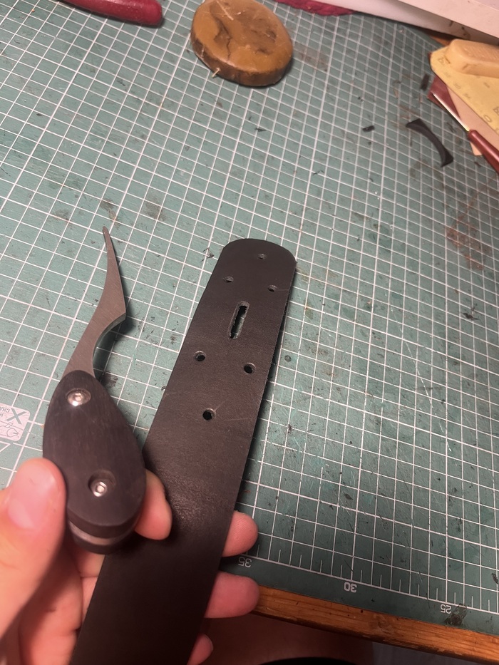 Пробиваем наши основные отверстия с помощью пробойника и киянки. Делаем противоположный край ремня.