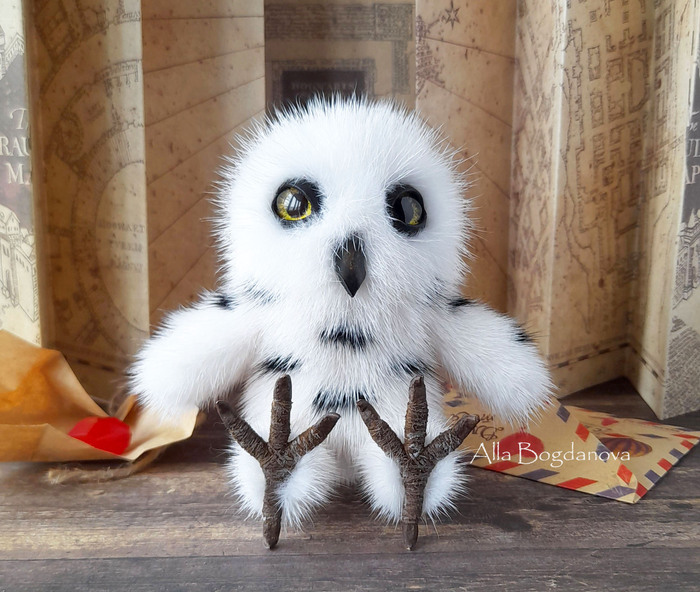 Покажу сегодня Сову) Она выполнена на заказ из меха норки, черные пятнышки вшиты вручную. Лапки и крылья на проволочном каркасе. Глазки стеклянные. Набивка - холлофайбер. Может сидеть, стоять, а также на голове есть маленькая петелька, если захочется подвесить на ёлочку или в машину на зеркало. Рост около 13см.
