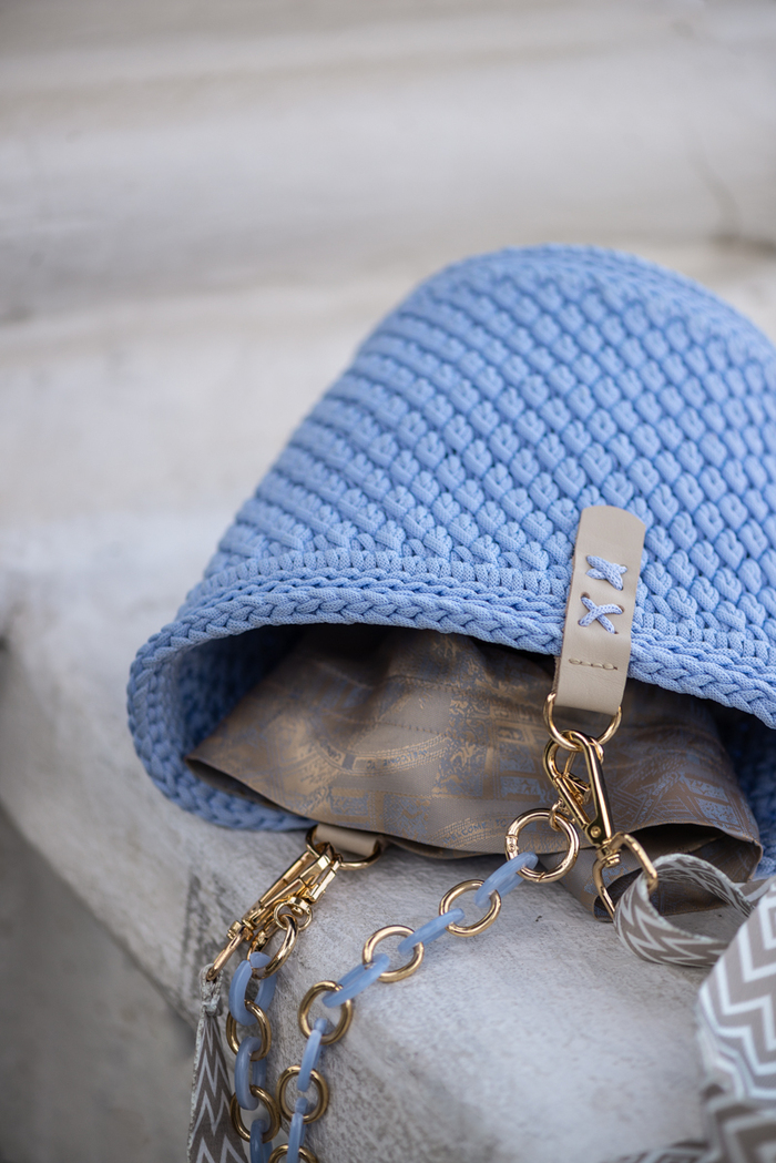 Сумка "Ведро" вязанная узором "шишечки" из полиэфирного шнура в цвете небесно-голубой.