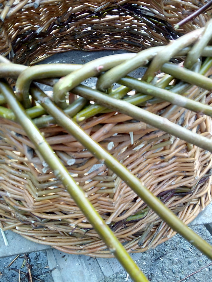 Послойное плетение ( можно один через один). Интересно что процент брака, даже на более тонком пруте, неизменен. С трудом, через пень –колоду, доделываю послойку, затем загибку кромки. Прут закончился. Фото потом.