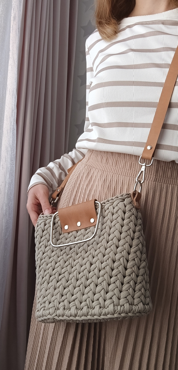 ✅ Вязаная сумочка на магнитной кнопке. Цвет пряжи: пыльная оливка Кожаная фурнитура: цвет кремовый