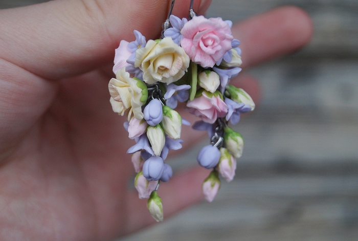 Лёгкие и воздушные серьги-грозди с сиренью и розами