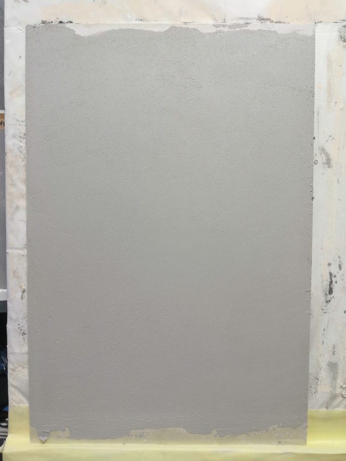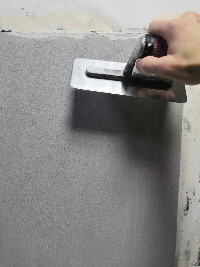 Материал очень плотный. Нужно приложить усилие к кельме, что бы разгладитьштукатурку. Толщина слоя должна быть в толщину песчинок материала (при работе с известковой декоративкой будет понятно, что я имею ввиду)