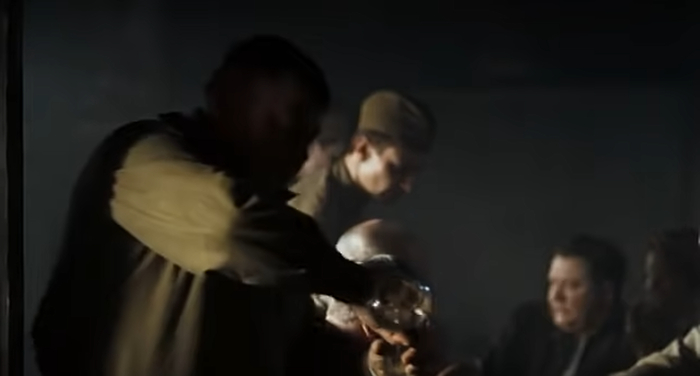 Пока блаженный демонстрирует своим товарищам отверстия от пуль, а товарищи над ним ржут, действие переносится в штаб, где все кому не попадя бухают. Тут и генерал, и капитаны с майором и прочие офицеры. Тут же и находится и командир штрафников, который в Предстоянии, своего на машине переехал. Жаль что вместе с ними, немецкие пленные не бухают, для достоверности.