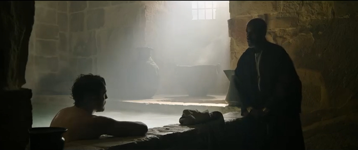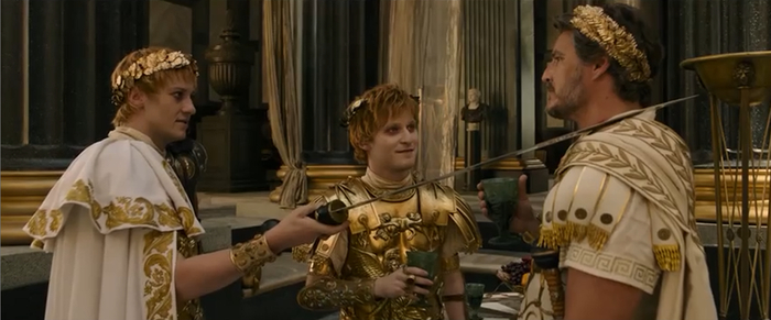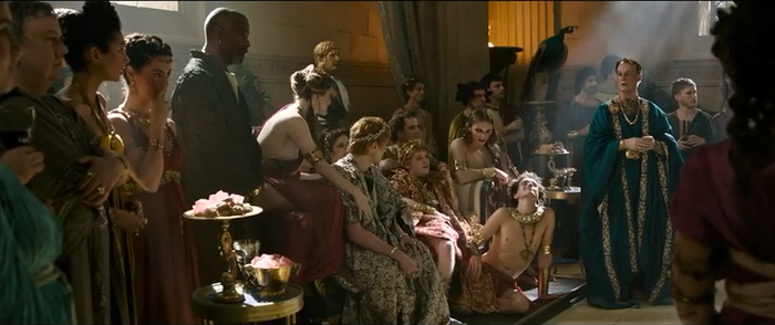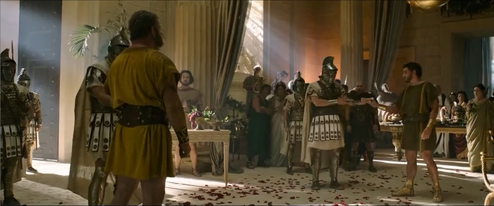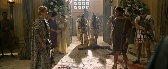Вроде бы по их плану, Гете должны были отойти восточные провинции со столицей в Антиохии или Александрии, а Каракалле — западные с центром в Риме. Но так из этой затеи ничего не вышло, Каракалла решил убить Гету во время праздника Сатурланий, но его план провалился, поскольку поползли слухи о его намерениях. Гета усилил охрану своих покоев, солдаты и тренированные атлеты дежурили у них днями и ночами. В итоге, Гету все же убили, но об этом немного попозже, а пока что возвращаемся к фильму, где творится та еще дичь.