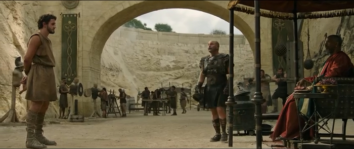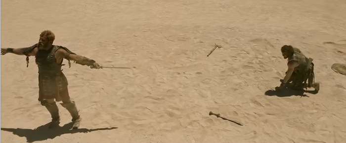 Оказавшись перед лучшими людьми Рима, Луций тут же демонстрирует свой непримиримый характер, он предлагает своему противнику, не сражаться ради потехи этих клоунов. Но бородатый гладиатор, не стал Луция слушать и тут же кинулся на него в атаку.