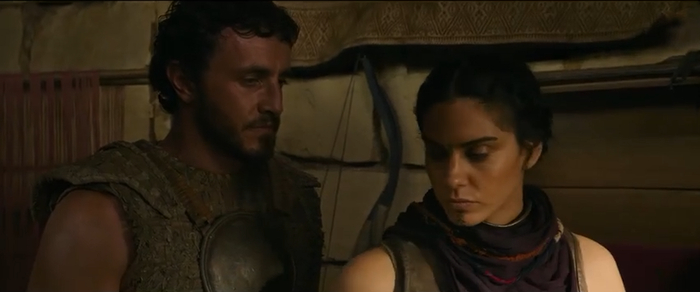 В результате, бородач победил, и вот уже два императора решают, умереть главному герою или жить. Но тут Луцилла, попросила Гету, оставить этому гладиатору жизнь. В тот момент, когда император поднял палец вверх, Луций отказался от римского милосердия, кинулся на противника и заколол его мечом.