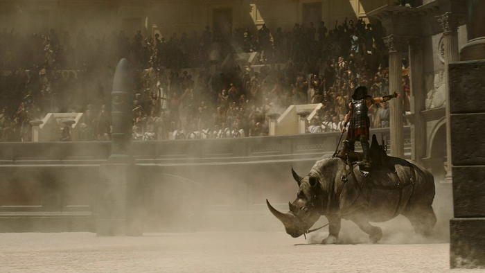 Против гладиаторов Макрина, выставляют бойца верхом на носороге. По примеру Максимуса, Луций попытался сплотить вокруг себе бойцов, давая им указания что надо делать. Только вот в отличие от Максимуса, Луций в фильме пустое место, никто из бойцов не стал его слушать.
