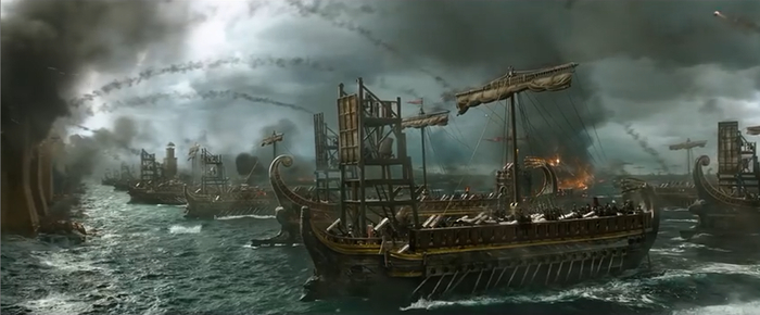 И вот римляне наконец то доплыли, разгорелась масштабная битва, Обе стороны, палят в друг друга из катапульт горшками с зажигательной смесью, стреляют из арбалетов и луков. Но тут корабли, вплотную приблизились к стенам города, командующий войсками римлян, командует опустить мост осадной башни. Одна беда, механизм моста заклинило.