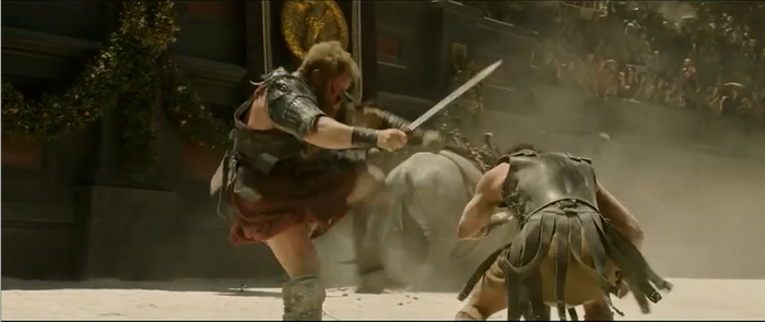 Ну а наездник, разогнав свою рогатую коняшку, принялся втаптывать гладиаторов Макрина по одиночке в песок, на радость толпе. И тут, Луцилла, в одном гладиаторе, узнала своего сына, когда он сделал то, что обычно делал Максимус перед каждым сражением, а именно набрав в руки песок.
