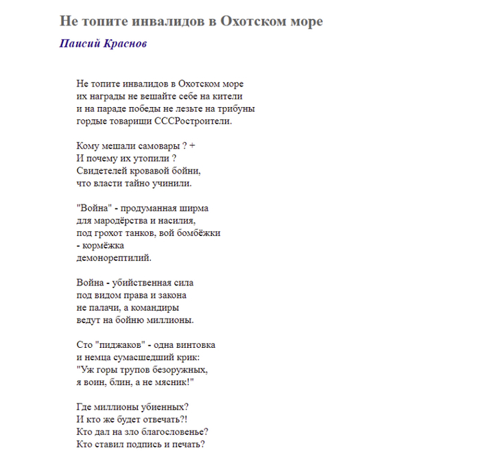 Тут откуда не возьмись, появился еще один очевидец, который видел как по реке Енисей, проплывали баржи с обездоленными инвалидами, которых везли на утопление. А это что за очевидец такой, имя и фамилия этого очевидца хоть будет? . А это один и тот же очевидец оказывается, ну которому пьяные конвоиры рассказывали. Мадам смотрю повторяется и за короткое время одно и тоже повторяет дважды .Кстати что за конвоиры такие? Где они служили, к какой части они относились?
