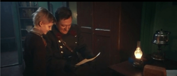 Ну а к Матроне Московской, приходит гость из НКВД, по приказу товарища Сталина, приносит с собой хлеб и селедку. Он все это невеликое добро, передает мальчишке, который все роняет на пол вместе со своими рисунками. Приголубив мальчика, злобный НКВД-шник, разглядывает рисунки и видит изображение товарища Сталина. Кровавый упырь тут же агрится на мальчишку и спрашивает, кто ему разрешил рисовать товарища Сталина.