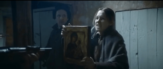 Только бородач скомандовал огонь, тут как тут немецкая облава, в Лютого выстрелить не успевают а вот Маша получает из винтовки пулю в грудь. Но Маша не умирает, пуля застревает в иконе, хотя пуля выпущенная из винтовки Мосина, насквозь прошивала стальную рельсу. Не икона, а прямо деревянный бронежилет.