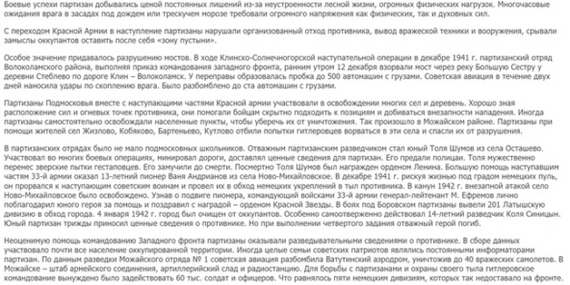 В самый разгар битвы под Москвой неоценимую помощь фронту оказали партизаны Подмосковья. Сразу же после постановления ЦК ВКП (б) «Об организации борьбы в тылу германских войск» от 18 июля 1941 г. в Подмосковье был создан областной штаб по руководству подпольным и партизанским движениями. Его возглавил секретарь обкома С. Я. Яковлев. На территории семнадцати районов, оккупированных полностью и десяти частично, были созданы пять окружных, шестнадцать районных и четыре городских подпольных комитета партии. В каждом захваченном фашистами районе области создавались два, три, а в отдельных – четыре партизанских отряда на 40-50 человек в каждом. Так, наряду с регулярными войсками захватчиков на подмосковной земле встретили и развернули борьбу более 60 партизанских отрядов и около 400 разведывательно-диверсионных групп общей численностью в 15 тыс. человек.