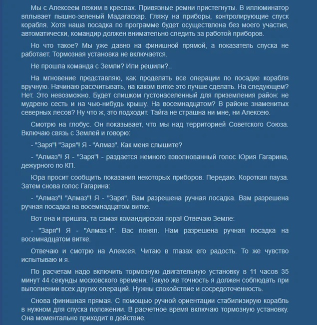 Опять же нет никаких истерик и переживаний, что их бросят умирать в открытом космосе. Да посадка вручную производилась впервые , но паники никакой не было, так как в космонавты выбирали самых лучших летчиков истребителей и испытателей. Истерички и паникеры типа Миронова и Хабенского, в космическую программу в реальности никогда бы не попали. На КП зафиксировали начало снижения корабля. Каманин говорит что хорошо бы понять куда космонавты сядут.