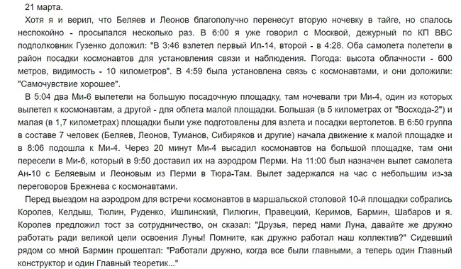 Еще раз, но немного подробнее. Да, эвакуировать космонавтов сразу не удалось, им пришлось две ночи ночевать в лесу из-за того что не было возможности произвести эвакуацию сразу. С вертолетов космонавтам сбрасывали теплые вещи и продукты, но вытащить Беляева и Леонова из тайги не удавалось. Группа лыжников с врачом, высадившаяся в полутора километрах, добралась до них по снегу за четыре часа, но вывести из тайги не решилась.