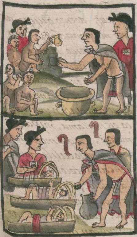 Флорентийский кодекс описывает, как «дяди» и «тёти» (друзья семьи) несли маленьких детей в храмы и давали им пульке (фото 4). Кроме того, детям шипами кактуса или агавы прокалывали мочки ушей (фото 5). Есть мнение, что ацтеки отождествляли растение агавы с детьми: во время Ицкалли агаве обрезали листья для роста. Детей растягивали с теми же целями. Во время празднования Ицкалли пульке лился рекой. А ещё женщины готовили невообразимое количество тамале: люди дарили их соседям и храмам, а также собирались вокруг очага в круг и бросали их в качестве подношений.