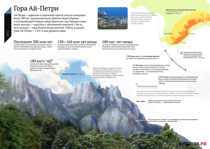 Как пишут в путеводителях, Ай-Петри — это символ всего крымского побережья, чья вершина взмывает в небо на высоту 1231 метр над уровнем моря и чем-то походит своими обломанными зубьями на исполинский средневековый замок. Когда-то там был греческий монастырь, но эти времена уже давно в прошлом — о них напоминает только название скального массива, что в переводе с греческого означает «Святой Пётр».