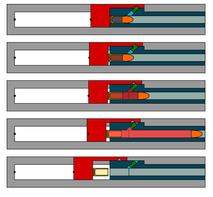 Однако вследствие того, что сила отдачи газов больше, чем сила действия поршня на затвор в сумме с другими силами сопротивления, затвор отходит назад. В результате этого затвор преодолевает движение поршня, заставляя последний опуститься вниз.