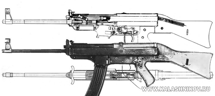 Однако от мысли о создании простого во всех отношениях автомата на принципе свободного затвора, но под более мощный патрон обр. 1943 г., немецкое Ведомство Вооружения не отказалось, и в своих требованиях оно направило конструкторов по пути создания такого автомата.