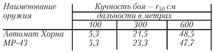 Кучность боя при стрельбе одиночными выстрелами из положения лёжа с упора (r50) на различных дальностях, в сравнении с МР-43 — приведена в таблице.
