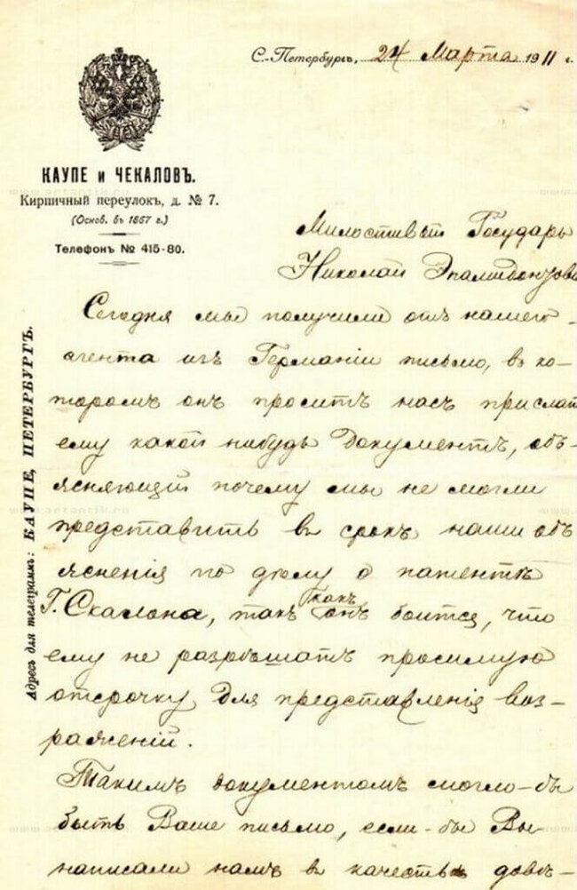 Ходатайство на привелегию от бюро «Каупе и Чекалов»