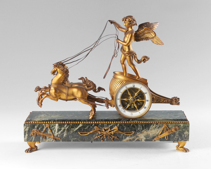 Французские часы-колесница с крылатым херувимом. Патинированная бронзовая фигурка херувима, стоящего на колеснице, запряженной двумя лошадьми, передняя панель отвинчивается, фарфоровое кольцо с римскими цифрами, циферблат в центре со спицами. Время и ударное движение отмечены медальоном Винченти. Мраморное основание с отделкой бисером и декором, все на 4 лапах.