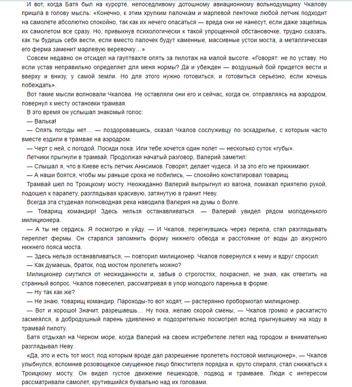Через какое то время, летит значит Чкалов со звеном в Брянск, сзади него сидит механик, который у него спрашивает, а правда ли что он как то под мостом летал. Тут Чкалов увидел железнодорожный мост, скорчив безумную рожу, и тут же направил самолет под сферы моста.