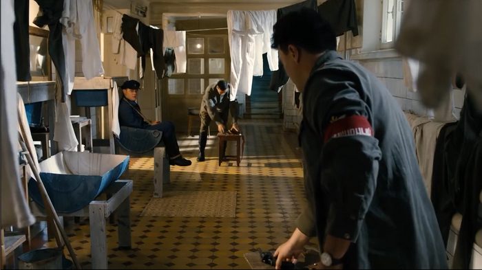 Следует объяснить, как Чугун так вовремя тут очутился. Дело в том, что связанный Гроховский, успел шепнуть одному человеку слово "караул", ну вот в умывальную комнату этот этот караул и прибежал, ведомый тем самым солдатом.