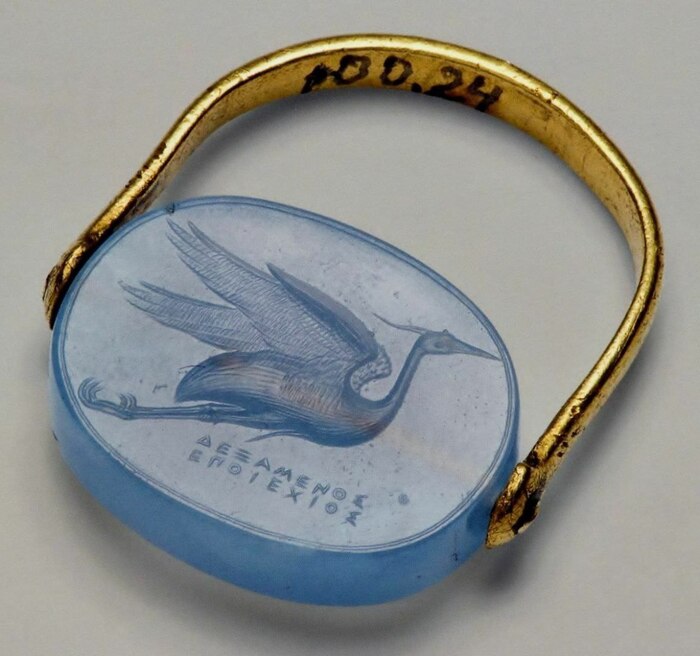 Кольцо с летящей цаплей. Греция, V век до н.э. Надпись на гемме гласит «Dexamenos epoie Chios» - «Работа Дексамена с Хиоса». Дексамен известен как один из искуснейших резчиков Древней Греции. Он работал в Афинах во второй половине V века до нашей эры.