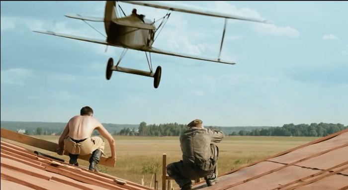 В самый разгар работы, прямо над головами строителей, пролетели два плохо нарисованных на компьютере фанерных самолета. От испуга, один из рабочих свалился вниз, правда так удачно для него, упал он на телегу с сеном, ну прямо ассасин из одной всем известной игрушки.