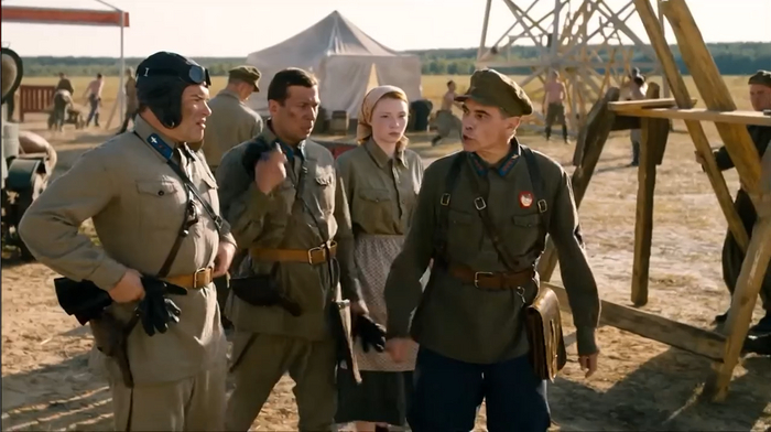 Ну а вслед за противогазами, летчики занимаются сборкой и разборкой пехотного оружия. Чкалов и Анисимов не понимают, зачем им это вообще нужно, строевая подготовка, противогазы, а теперь вот это. Ну Фесенко им и поясняет, что они не только летчики, но к тому же и командиры Красной Армии, и они должны уметь вести бойцов в атаку при любых условиях, на земле, в воздухе и даже на воде.