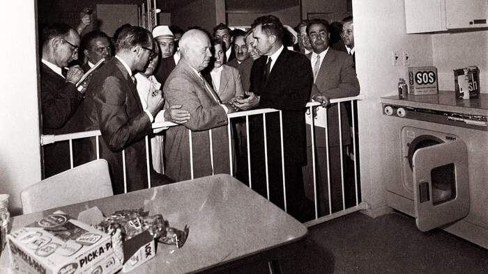 Одним из запоминающихся моментов экспозиции стали "кухонные дебаты" генерального секретаря ЦК КПСС Никиты Хрущёва и вице-президента США Ричарда Никсона. Политики горячо спорили о том, какая система лучше: советская или американская. Никита Сергеевич настаивал, что "через семь лет, мы будем на том же уровне, что и Америка. Когда мы вас догоним, и будем перегонять, мы помашем вам ручкой!". Также Хрущёву не понравилось, что американцы использовали свою выставку в пропагандистских целях своей идеологии. Тут с товарищем Генсеком согласиться можно, американцы мухлевали, чтобы показать роскошную жизнь американского обывателя. При нажатии на кнопку на кухне посуда сама мылась, робот-пылесос начинал ездить, а полки начинали открываться. На деле же всё это делал специально обученный человек, находившийся в другой комнате.