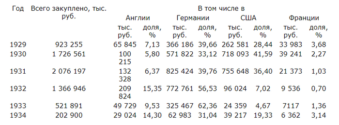 Ниже в таблице приводятся общие суммы советских закупок машин и оборудования в 1929–1934 гг., суммы закупок в Англии, Германии, США и Франции, а также доля каждой из этих стран в общем объёме советского импорта машин и оборудования.