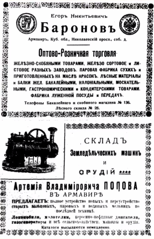 В начале 20-го века в этой усадьбе находились складские постройки, в которых размещалась сельскохозяйственная техника, агрегаты и промышленные устройства, принадлежавшие армянскому торговцу из Ростова-на-Дону Артемию Владимировичу Попову, мужу дочери Егора Никитича, Марии Егоровне. В главном доме на тот момент находились банк Первого Армавирского взаимного кредитного общества (до 1909 года), нотариальная организация И. Я. Яковенко (с 1911 года). Баронов интегрировал свой бизнес с компанией зятя в 1912 году. Итогом стало образование Торгового и Промышленного Товарищества “Е. Н. Баронов и А. В. Попов”. Это предприятие сразу же стало известной масштабной коммерческой организацией в Армавире и на Северном Кавказе.