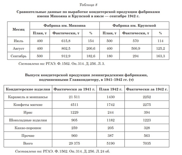 В верхней части – сравнение фабрики имени Микояна и имени Крупской в 1942 году, в нижней – сравнительная таблица по производству в 1941/1942 годах целой серией фабрик, подчинённых Главкондитеру. Как вы видите, фактическое системное перевыполнение плана очевидно. Как можно было перевыполнять план в осаждённом городе? За счёт кардинального изменения состава продуктов и повальной экономии.