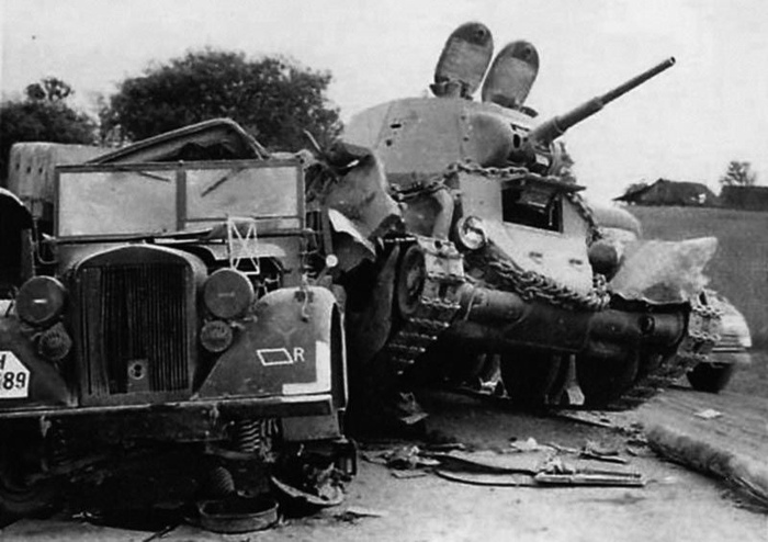 «Внезапно появились они.- писал немецкий фельдфебель, - Мы издали услышали гул двигателей, но все равно опоздали. Советские танки Т-26 и Т-34, ведя непрерывный огонь, продвигались параллельно нашей колонне. Уже через несколько секунд начался ад кромешный. Следовавшие в центре колонны три грузовика с боеприпасами взлетели на воздух. Жуткий взрыв разметал во все стороны их обломки». Вопящие от ужаса и боли люди, обезумевшие лошади — все перемешалось. Неожиданно русские танки сменили направление и, ведя непрерывный огонь, врезались в колонну. Никогда не забыть, как вопили несчастные лошади, попадавшие под гусеницы танков. Автоцистерна с горючим взорвалась, подняв огромный ярко-оранжевый гриб. Один из Т-26, совершая маневр, оказался слишком близко от нее и тут же в одно мгновение сам превратился в пылающий факел. Царила ужасающая неразбериха».